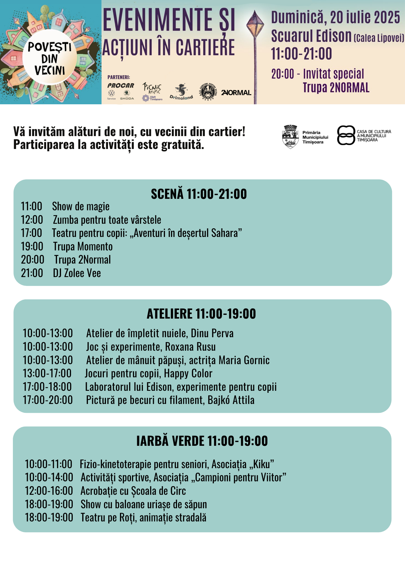 Începând de la ora 11:00, până spre seară, timișorenii din zona Calea Lipovei sunt invitați să petreacă o zi dedicată oamenilor și poveștilor care leagă comunități. Atmosfera va fi animată de activități pentru toate vârstele, de la spectacole și ateliere creative pentru copii și adolescenți, până la momente artistice, muzică live, zone de relaxare și spații de întâlnire pentru vecini, prieteni și familii.